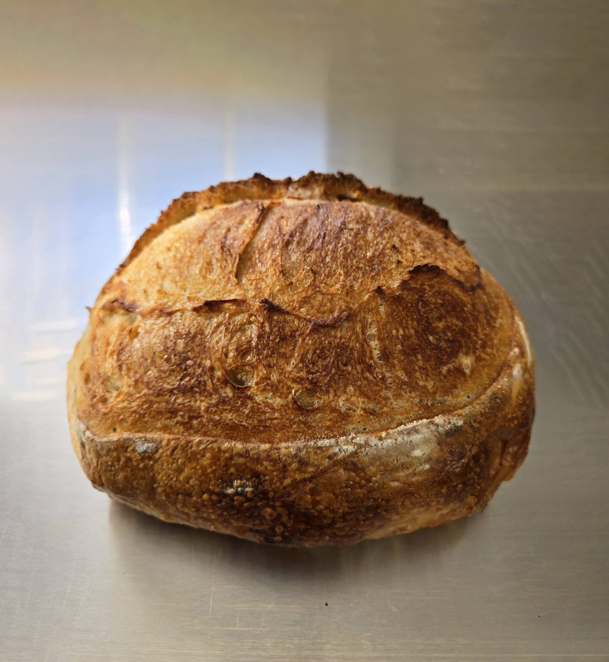 Pan de corteza crujiente con una miga poco ácida, adaptada al paladar criollo, de fermento completamente natural.